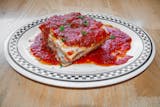 Eggplant layered with prosciutto, ricotta, tomato, mozzarella, and basil topped with marinara and fresh mozzarella cheese.